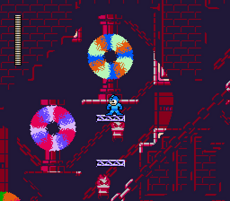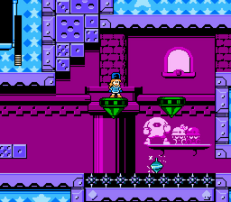 This temple-themed level contains several enemies crossed with Blocky, such as Swim Balls, Bubukan MK-IIs, and Browns. While contending with these detachable enemies, Mega Man must traverse the darker parts of the temple carefully, as the purple platforms, walls and ladders only become visible when he gets close to them.