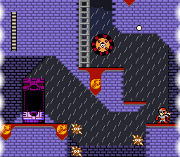After a brief, dimly-lit hallway of MetFire and Sparky enemies, Mega Man will arrive at a door leading into the first floor hub. The hub has no gimmicks, just ladders and platforms among the eight mini-stage portals.